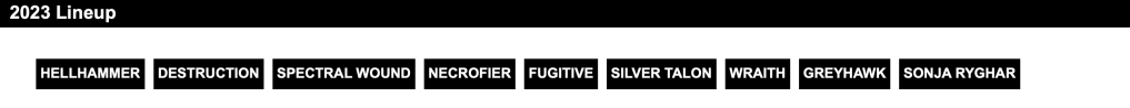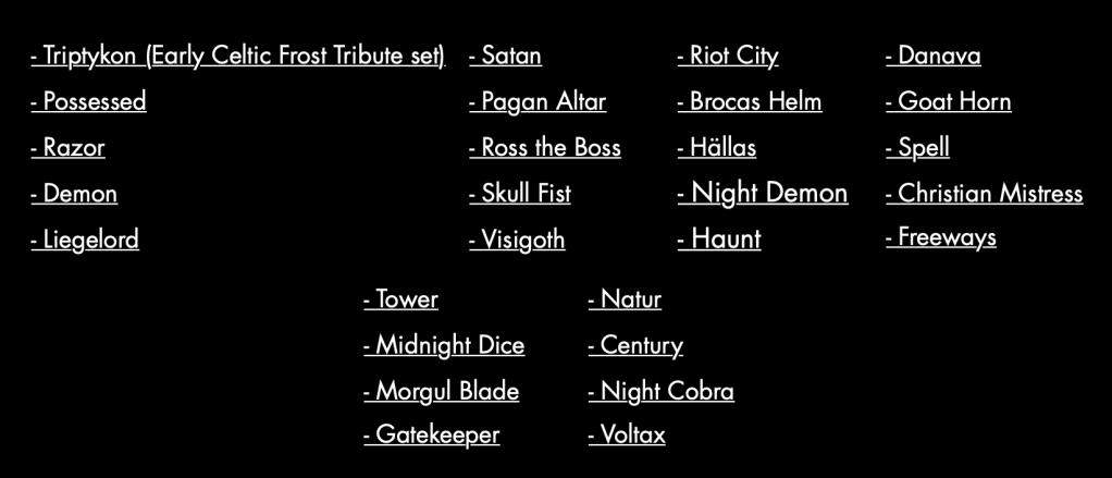 At the bottom of the page, I included the full setlist of bands. Similarly to the headliners’ logos, each band name on the list is hyperlinked. This is so people who have never heard of these bands can immediately reference them and hopefully become fans.